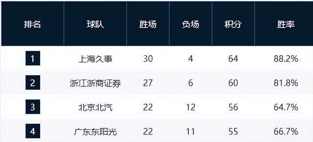 上海15连胜居第一,北京重回第3,广东屈居第4,辽宁输球跌至第9