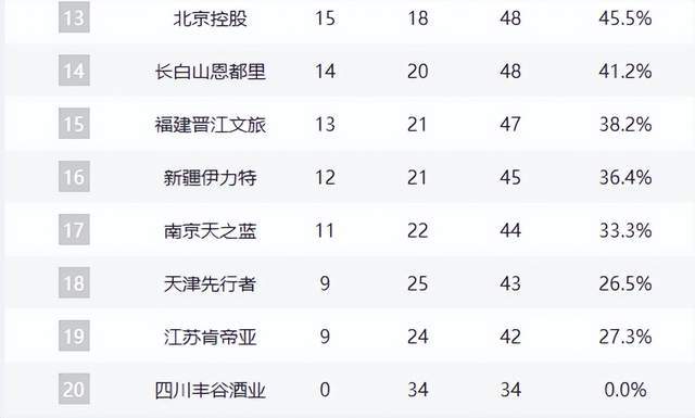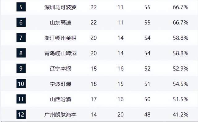 青岛队虽在本轮爆冷负于福建队,但仍以20胜14负与浙江队并列第7,竞争格局高度胶着。山西队(17胜16负)与宁波队(16胜17负)紧随其后,仍存理论希望。